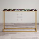 Simple console table with luxe material and finish is elevated by this beautiful Terrazzo - Green aventurine crystals fused with a hint of FOOL’S GOLD on a black canvas. Stainless steel legs are finished with a gold polish, creating a royal and mysterious look.
