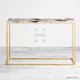White Agate Console Table A thin, stainless steel base with a matt gold finish complements the silhouette of our White Agate console table. The rectangular top hosts a large polished piece of White Agate. Set it against the wall, back...